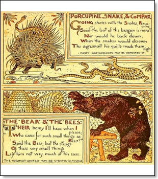 During the 1800s Walter Crane was considered Britain's greatest socialist artist, and he was asked to illustrate many socialist publications. However his best work was non-political in nature. He earned a good living doing book illustrations, and he was especially in demand as an illustrator of children's books such as nursery rhymes, fables and alphabet books. His drawings often featured child in the garden motifs, and were extremely influential in shaping the direction of children's illustrated literature, along with his collaborator, the printer Edmund Evans.