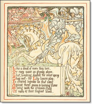 Walter Crane (born August 15, 1845 - died March 14, 1915) was an English artist and illustrator. He is primarily known for his illustrations of the Faerie Queen as well as numerous children's books, however he also worked on designs for political pamphlets and even wallpaper, ceramic tiles and other decorative art.